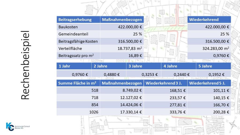 Anhand des Berechnungsbeispiels einer tatsächlich durchgeführten Maßnahme wird der Unterschied der Belastung für Grundstückseigentümer deutlich.